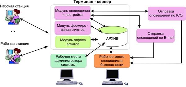 Она включает в себя модуль опроса агентов, который производит централизованный сбор информации (логов) с контролируемых рабочих станций; модуль оповещения и настройки; модуль формирования отчетов и базу данных, выполняющую роль архива.